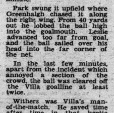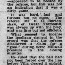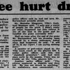Brian Godfrey scores for the third successive game since his debut and Brian Greenhalgh for the second consecutive match as Villa win for the first time in six to record their third win in twelve second division games under Tommy Cummings. Villa sit joint eighteenth, one point clear of the relegation places. The game though is notable for the referee being attacked by Millwall fans and leaving the field unconscious on a stretcher.