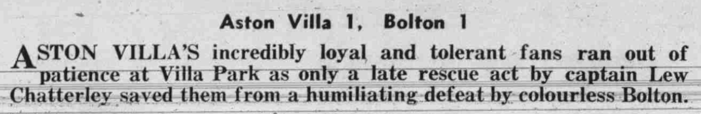 Villa make it three games unbeaten and climb to joint 11th in the table alongside opposition side Bolton and next opponents Huddersfield but the game is overshadowed by disquiet amongst the fan base at another sub-standard showing under Tommy Cummings described by the local media as "pathetic".