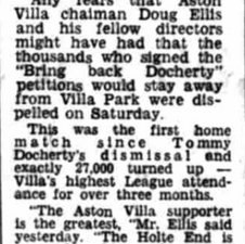 Scarcely believably however a horribly confused fan base submit a โBring back Dochertyโ petition and sing the former managerโs name in Villaโs highest League attendance for over three months whilst ignoring new boss Vic Crowe.