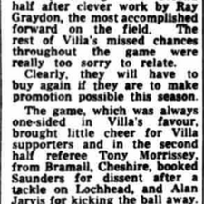 Even this early in the season, Villa suffer a โshockโ defeat as they are beaten at home by bottom side Mansfield (one point in six games) despite having had eighteen shots on goal (Mansfield four) in a game they, on balance, should have been victorious in by at least six goals.