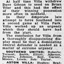 Villa lose to fourth division Southend in the first round of the FA Cup in a game that marks the final appearances of Tommy Hughes, Dave Gibson and Keith Bradley. For Hughes it is another difficult game after he drops the free kick that leads to Southendโs goal.