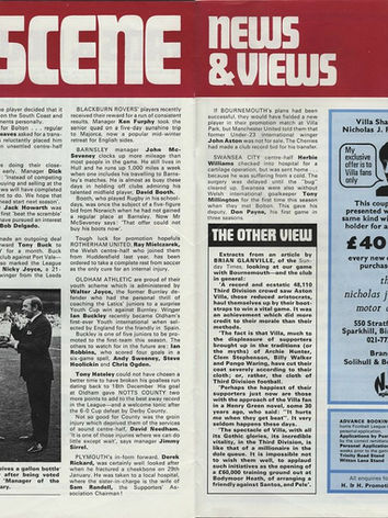 Vic Crowe's Villa make it eleven wins in thirteen and twenty one wins, three draws and six defeats in division three so far this campaign. Villa (played 30, points 45) remain top of the table ahead of Bournemouth (played 30, points 42) and their next opponents Notts County (played 28, points 41). Meanwhile, centre back Ian Ross made his Villa debut aged 25 after moving from Liverpool earlier this week for a fee of ยฃ60,000.