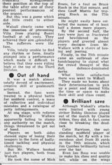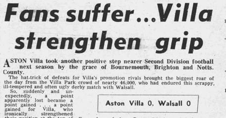 Vic Crowe's Villa draw successive League games for the first time this season and have now failed to beat neighbours Walsall both home and away this season and make it twenty three wins, five draws and six defeats in division three so far this campaign. Despite dropping points for a second consecutive game, Villa's position in the table strengthens as the teams around them lose. Villa, with one defeat in the last twenty games, (played 34, points 51) remained ahead of Bournemouth (played 35, points 49) and their next opponents Brighton and Hove Albion (played 34, points 45).