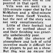 Villa are watched by their smallest Villa Park crowd since December 1968 as Pat McMahon hits a spectacular 35 yard shot that nestles in the top corner after 12โ to set Villa on the way to victory.