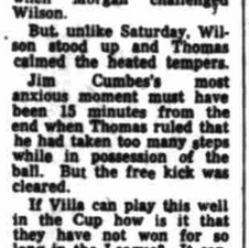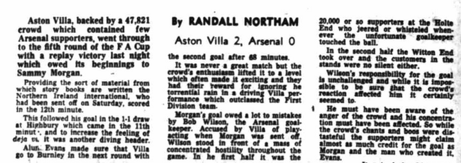 Villa dominate and beat first division Arsenal in the FA Cup fourth round replay at Villa Park as the villain of Highbury, Bob Wilson, gets his just desserts as his error costs his team the opener.
