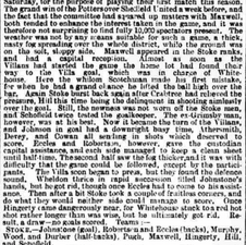 Maxwell appeared in the Stoke ranks, and had capital reception. Almost as soon the Villans had started the game the home lot had found their way to the Villa goal, which was in the charge of Whitehouse. Here the whilom Scotchman made his first mistake, for when he had a grand chance to score he lifted the ball high over the bar.