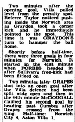 Two minutes later GRAPES shot into an open goal after the Villa defence had been split wide open and then in the 44th minute McDOUGALL claimed his second goal by heading past Cumbes after Grapes crossed from the wing. (IC 11111 g NORWICH CITY 5, A "I'M pleased we wonโbut it's great for football," said Bond after this goal feast a. And the fans will be the first to agree, on a ground where goalscoring is often at a premium. These two teams matched the holiday weather with an f attacking spectacular. It wasn't brilliant, tactical play from start to finish but there were moments which had the crowd purring with delight. Villa, managed by ex- Norwich boss Ron Saunders, took the League Cup when the two teams met at Wembleyโthen ruined Canaries' promotion celebrations with a 4-1 win at the end last season. But Norwich forgot these disappointments with a storming 15-minute display at the end of the first half, that brought them three goals and drained Villa's confidence.