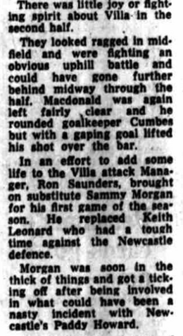 Villa are still looking for their first away win of the season. It never looked Uke coming against Newcutle at St. James's Park on Saturday. Despite a bright opining Villa ct.nceded a soft goal early on and never really recovered going down 3-0. Villa conceded a third goal in the lest minute when Macdonald had the crowd chanting "Supermac" after a fantastic goal, The England leader was put In possession by Cowling and Macdonald beat almost the entire Villa defence before League tables to 1 try %rwcaraly Mldrilembro k.yertan 1 2 โขiii rwtc 2 โข Dirby P.M, Man City 2 I 3 Sumter 1 3 2 Ipswich 6 1 3 2 Lelcriitrr 6 0 5 1 Aston Villa 6 2 I 3 TottYaltaiM 6 1 2 3 Wol 6 1 2 3 ok ves 6 0 3 3 Ilirmtrobam a 2 4 Sheath. Utd 6 0 1 5 taking aim to lend his shot past Cumbes for Newcastle's third goal. Newcastle after two conaerutive away defeats took only five minutes to take the lead. It had been all Villa when a slip in the Villa defence between Robson and Cumbes allowed the country's top scorer Malcolm Macdonald to nip in and score after just Ave minutes. It was Macdonald's seventh goal of the season. After this Newcastle goal out of nothing Villa tried hard to get back into the game. Newcastle had been put under pressure with efforts from Phillips, Aitken and Graydon and Aitken was particularly unlucky to see his shot headed off the line. Villa were under pressure as they lot control of midfield and they were lucky not to fall further behind. The attack was making little impression on the Newcastle defence and the two best efforts came from Chris Nicholl headers from Ray Graydon's corners. But it was from the right wing that Newcastle increased their lead in 43 minutes. It was a cracker from Craig who took a pass after Gowling had beaten the Villa defence and sent home a terrific leftโขfooted drive. There was little joy or fightbug spirit about Villa In the second half. They looked ragged in mid. field and were fighting an obvious uphill battle and could have gone further behind midway through the half. Macdonald was again left fairly .clear and he rounded goalkeeper Cumbea but with a gaping goal lifted his shot over the bar. In an effort to add some life to the Villa attack Manager. Ron Saunders, brought on substitute Sammy Morgan for his first game of the season. He replaced Keith Leonard who had a tough time against the Newcastle defence. Morgan was soon in the thick of things and got a ticking off after being involved In what could have been a nasty incident with Newcastle's Paddy Howard. Billy Bremner spurred Leeds on to their four victory a 3.0 thrashing of Wolves at Elland Road leaving them third placed in the first division two points behind leaders Manchester United. Ipswich boss Bobby Robson voiced the fairs of the other first division managers when he said yesterday: "We can't afford to let them get too far away. As far as we are conโข cerned six points is quite a lot to make up even at this stags of the season." Ipswich one of the cham- pionship favourites took a point from a goalless draw at Coventry and have now gone four games without defeat.