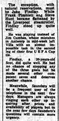The exception, with natural reservations, must be Jake Findlay. While Frank Pimblett and Steve Hunt became flattened by the Liverpool steamroller, Findlay stood up quite well. He was playing instead of Jim Cumbes, whose mistakes in Antwerp in mid-week left Villa with an almost impossible task in the second leg of their first UEFA Cup tie.