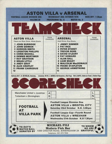 ๐ฉ 20 Oct 1976, Villa 5-1 Arsenal, Villa Park