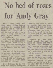 Andy Gray scores for the ninth time in as many games as Frank Carrodus dubiously claims the first before conceding an own goal equaliser for Liverpool. Villa though show their resilience with the winner on 72โ to climb to 6th in the table under Ron Saunders.