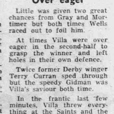 Villa dominated and almost had a second goal after 27 minutes. Gidman, after another exciting run, cut in to hammer a superb left foot shot which Wells beat down. Shelton could only push the rebound over the bar.