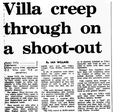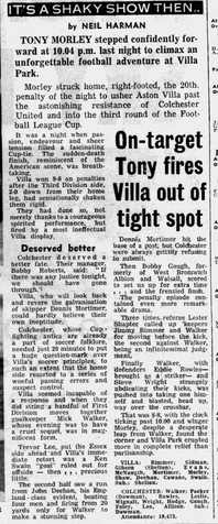 It was really not Villa's night until they crept through with Morley's penalty decider. Ken Swain had a "goal" disallowed after 24 minutes when Mortimer and Shaw both ran offside and Mortimer hit the upright midway through the second half with Walker stranded.