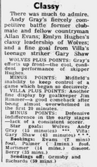 Wolves should, of course, have buried their old rivals in the first 20 minutes with Andy Gray giving his former club-mates a real fright. Gray scored in the 15th minute after Daniel had back-headed a free kick by Parkin and it seemed that Wolves were going to win by a mile.