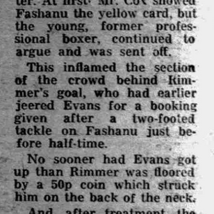 Then after Evans had been booked and Fashanu sent off, a bottle hit Rimmer on the neck and laid him out.