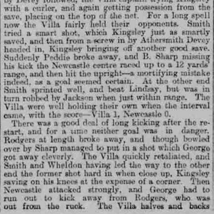 The weather in Birmingham yesterday afternoon was the most miserable description, but, notwithstanding this, fully 20,000 spectators put in an appearance at Aston Lower Grounds. Newcastle enthusiasts were there in strong force, there being four special trains from the northern town to the capital of the Midlands. Rain fell in pitiless drizzle at the start, and continued throughout the greater part of the afternoon the going was very heavy. Both teams were full strength. The Villa won the toss and played with the wind behind them in the first half. The game was of a most sensational character, for at the very outset the home forwards got down, and Athersmith sent in a high shot which Kingsley failed reach. This early success fairly roused the visitors, and they attacked strongly, George kicking away from Peddle. Evans relieved, and the home men were soon at the other end, Wheldon compelling Kingsley to concede a corner.
