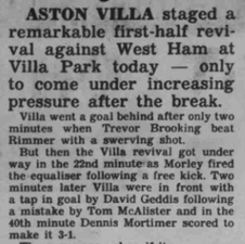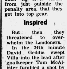 Scorer(s) | Tony Morley | 25' | David Geddis | 26' | Dennis Mortimer | 40' |