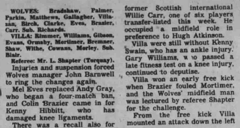 Assist(s) | Peter Withe | 30' | Dennis Mortimer | 46' |
