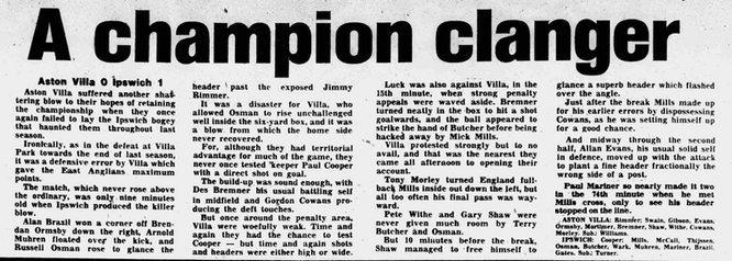 Bobby Robson brings a defensive Ipswich to Villa Park and lucks into a victory as reigning Champions Villa lose for the first time in fourteen games and the first time in ten League matches to make it three wins, six draws and three defeats in their title defence as they fall back to 12th in the table.