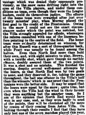 "Now was the North End’s time, for snow began to fall heavily, and they swooped down the field like a pack of wolves time after time. However, the Villa defence was sound, and while the snow lasted, the home lot could not get their lead to a more substantial figure."
