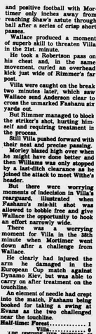 โHe drove over the Villa barโthe last action before the game was interrupted in the 20th minute. Villa are due to meet West Germany's Bayern Munich in the final in Rotterdam on May 26.โ