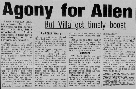 Pat Heard is the hero at the Hawthorns as he secures victory for reigning champions and European Cup finalists Villa whilst Cyrille Regis is sent off for Albion after a tussle with Ken McNaught.