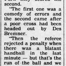 "It was a blatant penalty. He pushed it away with his hand. I was horrified the referee [Alan Saunders] didn't give it.