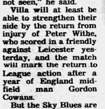 Gordon Cowans makes his first appearance since the 1982-83 season after missing the entirety of the previous campaign through injury.