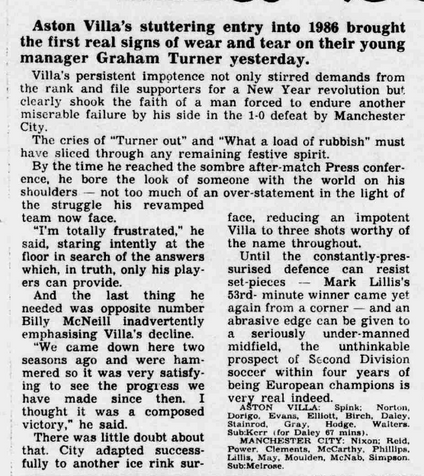 Villa open 1986 with defeat and now have one win in ten first division games under an increasingly pressurised Graham Turner. Meanwhile youth team coach Brian Little quits as Turner refuses to back him in improving the set up.