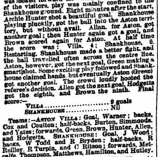 Allen shot a seventh from a run by Brown, Hodgetts made the eighth, and Brown the ninth, the Villa really playing with their opponents at the finish, the final score being - Aston Villa 9 goals, Shankhouse 0.