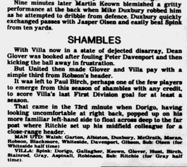 Villa finish bottom of the first division, relegated ten points off safety something that had appeared inevitable since the early days of the Graham Turner ๐ด๓ ง๓ ข๓ ฅ๓ ฎ๓ ง๓ ฟ regime three seasons earlier.