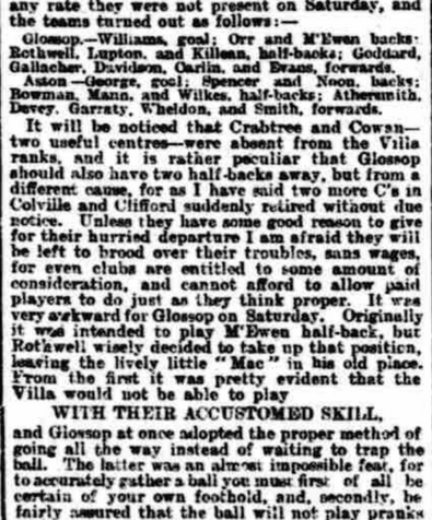 At this juncture Mann appeared to have a glorious chance, but shot past, and Villa again took the ball into the home territory, but Glossop’s custodian was impeded, and a free kick was awarded.