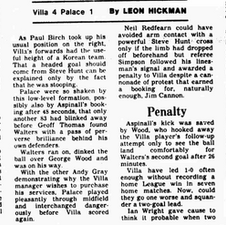 Villa take a second minute lead for the third time in five games as Palace are destroyed by a Mark Walters ๐ด๓ ง๓ ข๓ ฅ๓ ฎ๓ ง๓ ฟ hat-trick to send Villa 5th in the second division table.