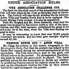 Secretary Manager George Ramsay's Villa face off against the mighty North End in a game billed as "The Great Football Match", that sees the two best teams in the land play one another for the first time in League or Cup football. But the game is overshadowed by controversy caused by the utterly shabby behaviour of referee Clegg and Preston's Suddell. By FA dictat the holders are knocked out in the fifth round.