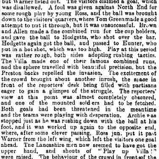 The rest of the Villa vanguard, especially Hodgetts, were not playing up grandly. They came down the field in a line, and certainly had luck in not scoring. Hodgetts worked his way through his opponents, and made a shot, which soared over the bar. Gordon and Ross, junior, afforded temporary relief by a fine run on the right; but Cox stopped them, and returned the leather to his forwards, who again raced down the field and Ferguson fisted out a shot from Allen. The game was stopped for a few moments in consequence of Ross senior, getting winded and on his recovery the Villa again pressed, but carried the ball outside. The Preston right wingers raced away up the hill, but Cox was too good for them, and the Villa once more drew near the North End citadel. They were stopped in full flight by a foul, and then the North End slowly but surely worked their way up the field. Yates tackled Drummond, but was beaten, and the Prestonian left winger centred to Goodall who scored the second point for the visitors amid much excitement. For a few minutes the Villa persevered, and Dawson had hard luck in not equalising; but then they appeared to lose courage. The result was that the Preston North End began to have the best of the game, and the Villa goal was kept in a constant state of bombardment. The Villa offered a grand defence but the attack was irresistible and Goodall soon put on the third goal. It is impossible to give a further accurate description of the game as the spectators in the unreserved portions of the field broke into the reserve, and, crowding around the reporters’ seat, obscured the view. An attempt was made to send them back, but the officials were unable to cope with the crowd, who were now ten deep in front of the Press desk. It appeared, however, that the North End had the best of the play, and Warner saved shot after shot. Just before the finish the Villa got down again, and Ferguson was forced to use his hands.