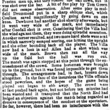 Hodgetts and Allen got away on the left, and the latter player put in two fine shots, but neither got home. A moment later Brown made a shot from the right, but the ball passed the wrong side of the post. Ross and Gordon carried play into the Villa’s half, and the latter centred, but Yates kicked clear, and then Ross was forced to kick out on account of a sharp attack by Hodgetts and Allen. North End again pressed, but Goodall shot outside. At this point another ten minutes’ interval ensued, the time being taken up in getting back the crowd, which had again encroached into the field. It was not without some difficulty that the ground was again cleared. It was observable that the umpires, referee and captains were holding a conference, and it was rumoured that it was decided that it was impossible to play a cup tie. However that may be, it was thought advisable to go on with the game, for the reason, it was stated, that otherwise a riot would have ensued.
