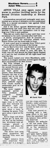 Villa find themselves two goals down after 55' to twenty two game unbeaten Blackburn but pull back to equalise in the 83' before Barcelona's on-loan striker Steve Archibald scores a late winner to leapfrog Villa to the top of the table.
