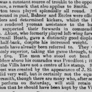 A spell of equal play followed until Gray and Settle worked their way towards George, the homesters for a time being hemmed in. George cleared, and again the Villa had a look in, but Eccles and Balmer stoutly denied admission.