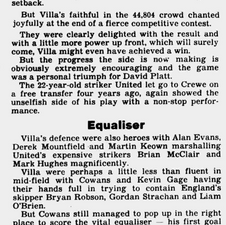 That goal, or possibly their half-time talk, at last provoked Aston Villa into some sort of activity. Almost immediately. Tony Daley got away for a cross which forced Jim Leighton to his first serious save of the afternoon. That gave United a warning which they failed to heed and on the hour Villa broke away for the equaliser.