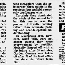Then Gordon Cowans hooked a dipping shot just over the Liverpool bar after 52 minutes.