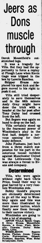 A horrific game in which Villa outclassed Wimbledon ๐ด๓ ง๓ ข๓ ฅ๓ ฎ๓ ง๓ ฟ in play and personality but lose.