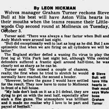 Graham Turner enjoyed a reasonable return to Villa Park, where he was dismissed as manger three years ago. His WOLVES side went down 2-1 to ASTON VILLA. David Platt put Villa ahead in 16 minutes, before Andy Mutch headed his fourth goal in three games for Wolves. Villa skipper Stuart Gray hit the winner.