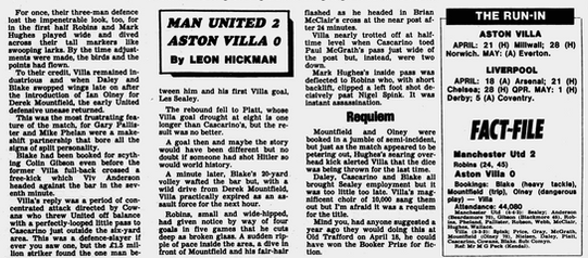 By then it was too late. Robins had already boosted his personal tally to six goals in six matches. On from the start, he put United ahead in the 25th minute with a superb diving header. Then Mark Hughes' penetrating pass from the right sent Robins racing into the box and he nonchalantly chipped goalkeeper Nigel Spink. Viv Anderson also hit the Villa bar in a game the Midlanders needed to win to overhaul Liverpool.