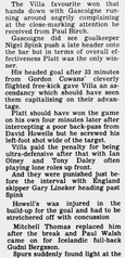 Platt and Tony Daley probed and prodded the Tottenham defence while Paul McGrath kept Gary Lineker quiet for most of the match, even Gascoigne found it difficult to escape Paul Birch's tight marking and only once managed to break through the Villa defence forcing keeper Nigel Spink scramble the ball to safety.