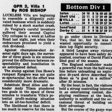 The slump against Don Howe's rampant Rangers was not quite so spectacular, but the effect was considerably more dramatic. Substitute Brad Allen and defender Andy Tilson plundered two goals in the space of three minutes to transform Villa's potential profit-making situation into an all-too-familiar deficit.