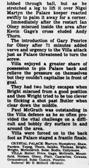 While Palace have built on their FA Cup Final defeat, Villa have taken a step backwards since finishing runners-up last season. The signs of that success are still there though, and will provide a useful bulwark as Villa attempt to stave off any relegation threat. Defensively, they functioned like they used to of old, with Paul McGrath mopping up here and there behind Kent Nielsen and Derek Mountfield.