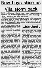 New boss Ron Atkinson’s first game in charge comes against the club he left to join Villa and amid an acrimonious atmosphere Villa fall two behind before Atkinson’s new signings inspire a celebrated fight back to claim victory.