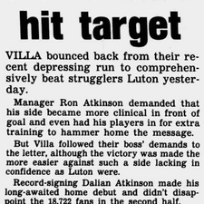 Meanwhile, goalscorer Paul Mortimer gives the Holte End a two fingered salute. Despite only recently arriving at the club, Mortimer would soon be ushered out the exit door by Atkinson having made 13 Appearances, 11 Starts, W4 D4 L5, 1 Goal and 1 Booking so far in his Villa career.