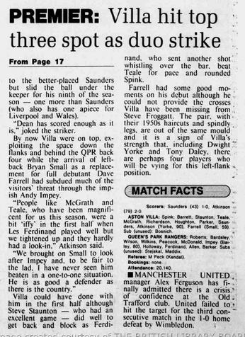 Villa climb back to 4th in the Premier League table under Ron Atkinson.