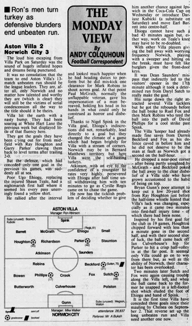 Ugo Ehiogu, standing in at centre half for the injured Shaun Teale, has a nightmare time but contributes his first assist in a Villa shirt on his 15th appearance (7 Starts) to make it W9 D3 L4 and 1 Assist so far in his Villa career.